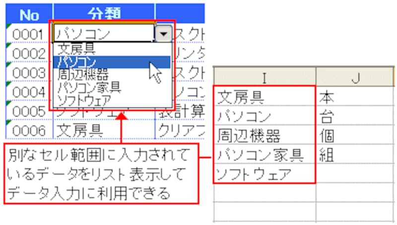 「分類」であれば「文房具」「パソコン家具」・・・、「単位」であれば「台」「個」・・・、といったように、入力する語句が決められている項目があります。こういった項目では、入力規則の「リスト」を利用しましょう。この機能を利用すれば、決められた語句をリストから選んで入力できるので、入力ミスのない効率的なデータ入力が可能になります。