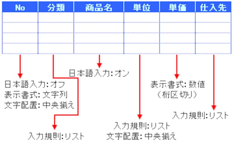 以上のポイントを踏まえ、今回の商品リストでは、次のようにデータの形式を設定してみました。その他、ここでは、適宜、文字配置についても設定しています。