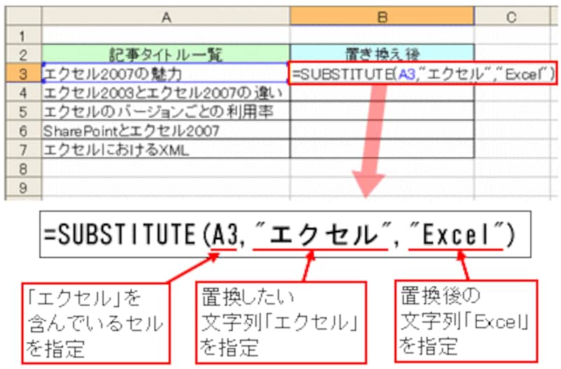 先ほどの例で、「エクセル」を「Excel」に置き換えるには、次のように入力します。