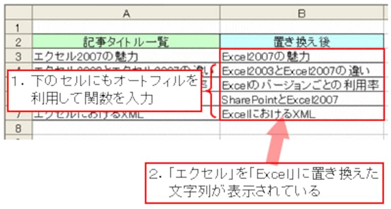 結果は次の通り。SUBSTITUTE関数を入力したセルに、「エクセル」を「Excel」に置き換えた文字列が表示されていますね。