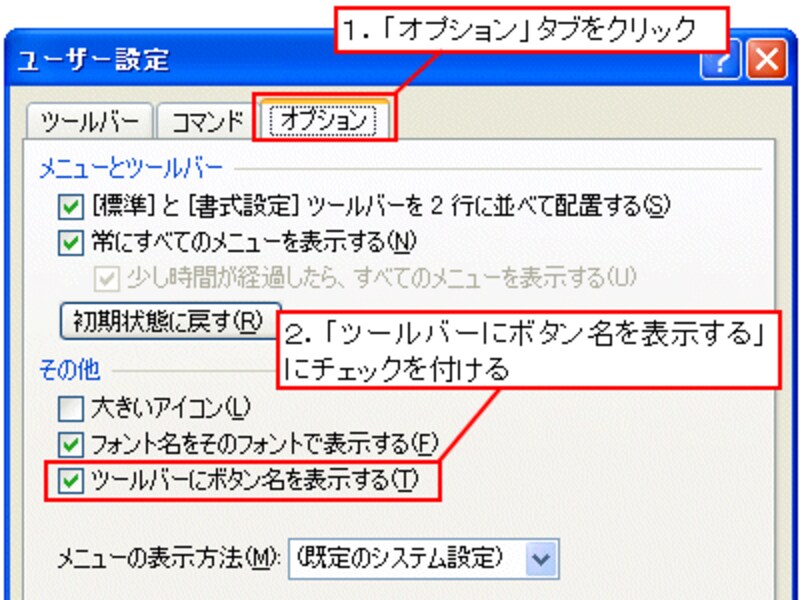 なお、ポップアップでボタン名が表示されない、という場合は、「ユーザー設定」ダイアログボックスの「オプション」タブをクリックして、「ツールバーにボタン名を表示する」にチェックを付けてください。