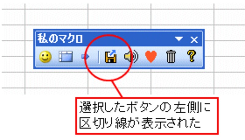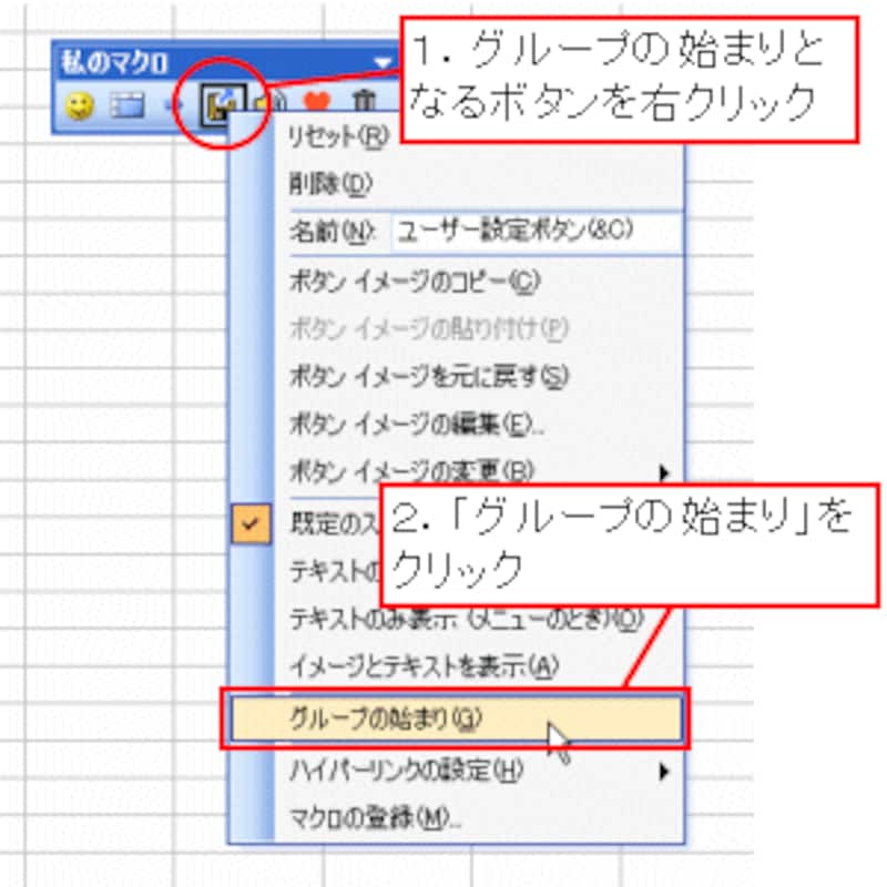 また、区切り線を表示してボタンをグループ分けすると、ボタンの整理がついて見分けがつきやすくなります。区切り線を表示するには、「ユーザー設定」ダイアログボックスを表示してからグループの始まりとなるボタンを右クリックし、「グループの始まり」をクリックします。