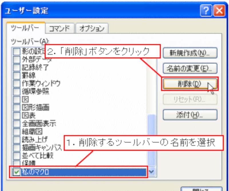 最後に、作成したツールバーを削除する方法をご紹介しましょう。まず、「ユーザー設定」ダイアログボックスを表示してから「ツールバー」タブをクリックし、ツールバーの一覧から削除するツールバーの名前を選択して「削除」ボタンをクリックします。