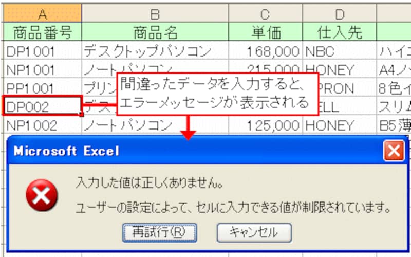 入力規則を設定したセルに間違ったデータ(設定した条件に合わないデータ)を入力すると、エラーメッセージが表示されるようになります。これなら、万が一、入力ミスがあったとしても見逃すことなく、その場で修正できますね。