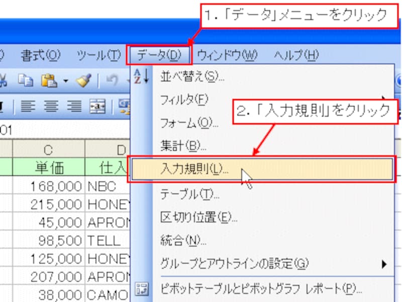 入力規則は「セル」に対して設定する機能です。従って、入力規則を設定するには、まず、設定したいセルを選択します。![]() |