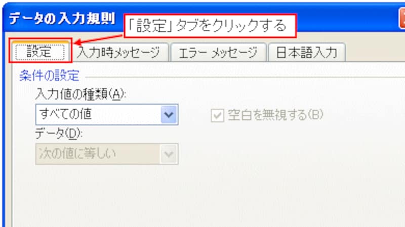 表示された「データの入力規則」ダイアログボックスの「設定」タブをクリックします。