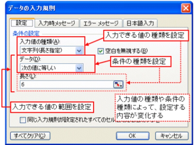 入力規則で設定するのは「「何の値」を「どの範囲」で入力できるようにするか」でしたね。「何の値」、つまり、入力できる値の種類は「入力値の種類」で設定します。「どの範囲」、つまり、入力できる値の範囲は「データ」とその下に表示される条件入力欄で設定します。