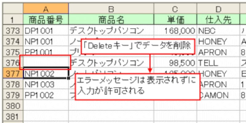 「空白を無視する」の設定は、「空白値」の入力を許可するか、しないかの設定です。したがって、「空白値を許可しないセル」、つまり「必ずデータが入力されている必要があるセル」に対してはチェックをはずす、といった話になります。しかし・・・。「BackSpaceキー」で削除した空白値に対してはエラーメッセージが表示されるのですが、「Deleteキー」で削除した空白値は許可されてしまいます。