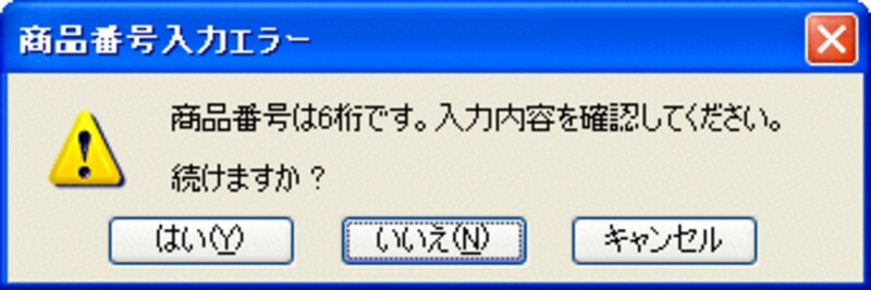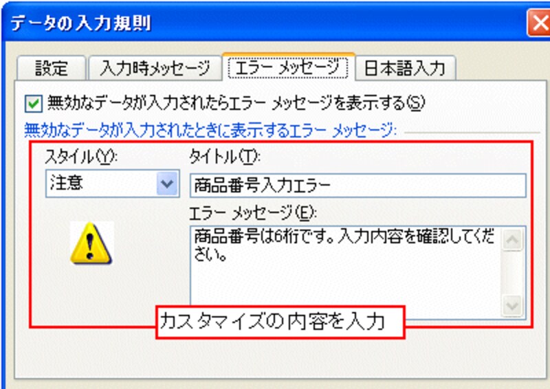 入力規則に反したデータを入力したときに表示されるエラーメッセージは、次の画面でカスタマイズできます。表示させる文言だけでなく、その左側のアイコンとボタンの組み合わせも変更できます。詳しくは、ガイド記事「入力規則のメッセージをカスタマイズしよう」をご覧下さい。![]() |