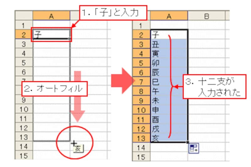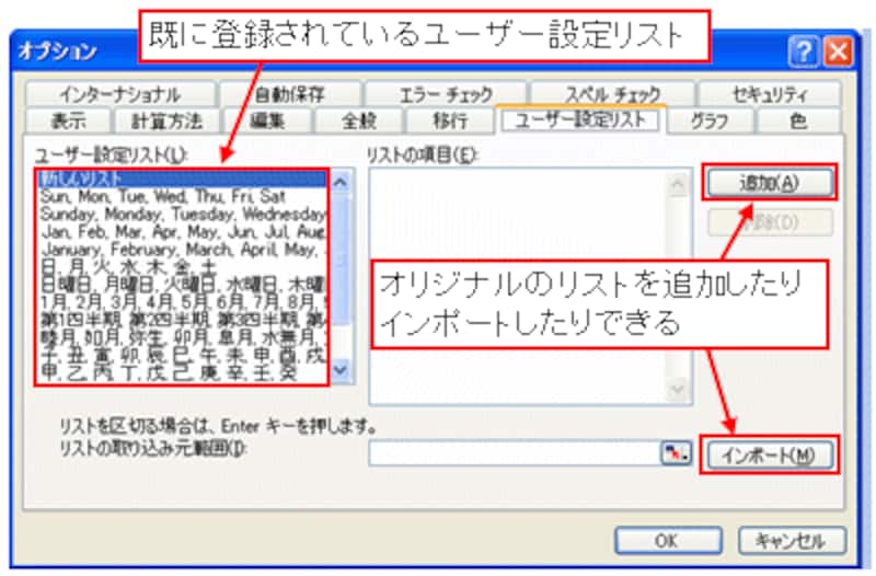 ユーザー設定リストには、曜日の順番(日,月,火,水・・・)や干支の順番(子,丑,寅,卯・・・)があらかじめ登録されています。このリストを使うと、オートフィルを使って曜日や干支の順番にデータを入力したり、並べ替えたりできます。