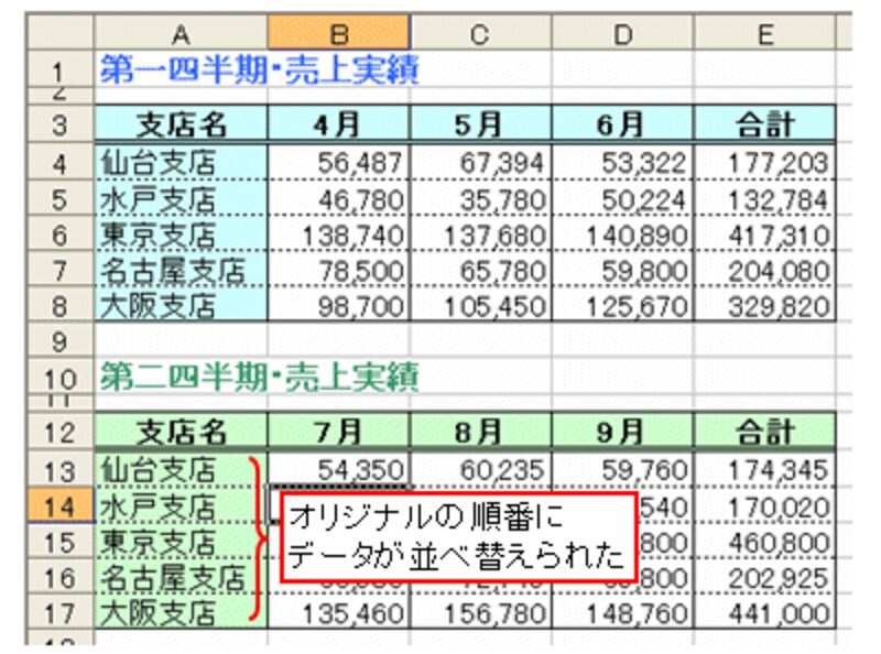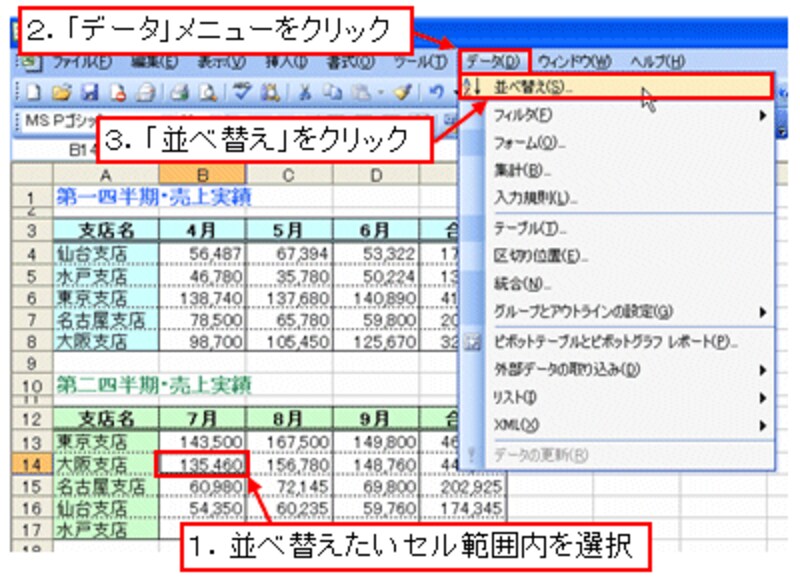 それでは、作成したユーザー設定リストを使って、データをオリジナルの順番に並べ替えてみましょう。並べ替えたいセル範囲内を選択して、「データ」メニュー→「並べ替え」をクリックします。