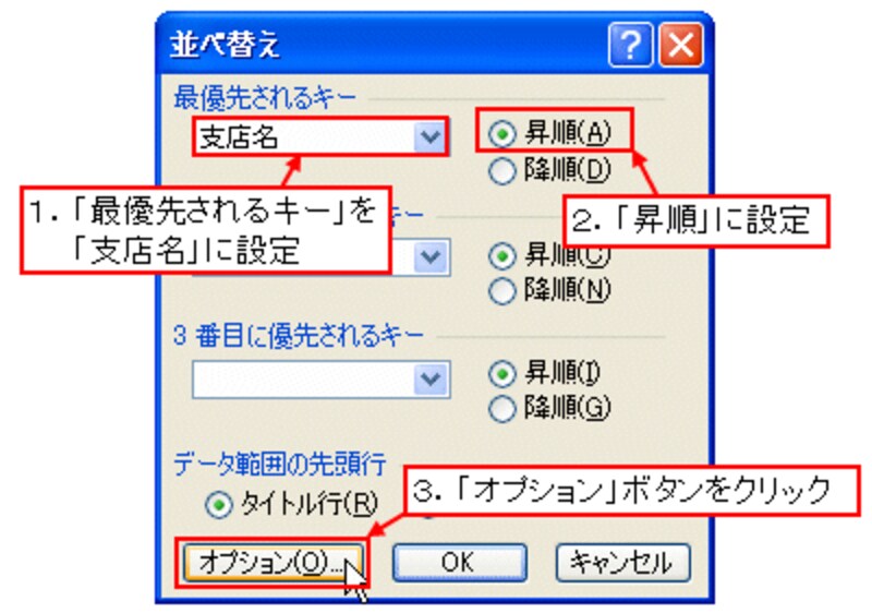 並べ替えたいセル範囲全体が選択されていることを確認し、表示された「並べ替え」ダイアログボックスで「最優先されるキー」を設定して「オプション」ボタンをクリックします。