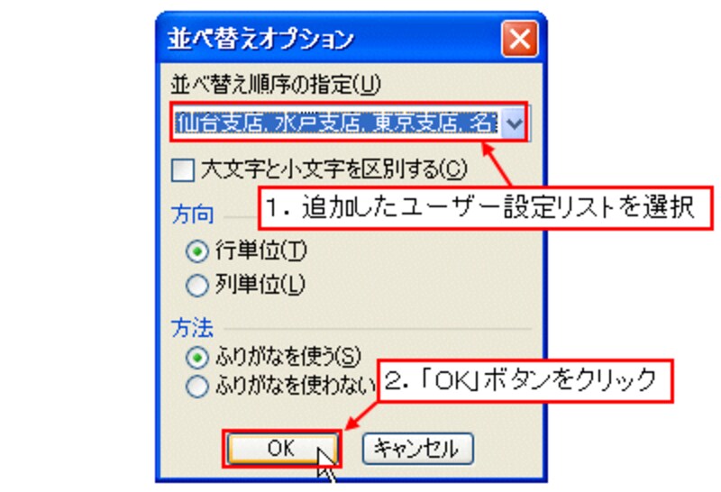 表示された「並べ替えオプション」ダイアログボックスの「並べ替え順序の指定」の一覧から、先ほど追加したユーザー設定リストを選択して「OK」ボタンをクリックします。