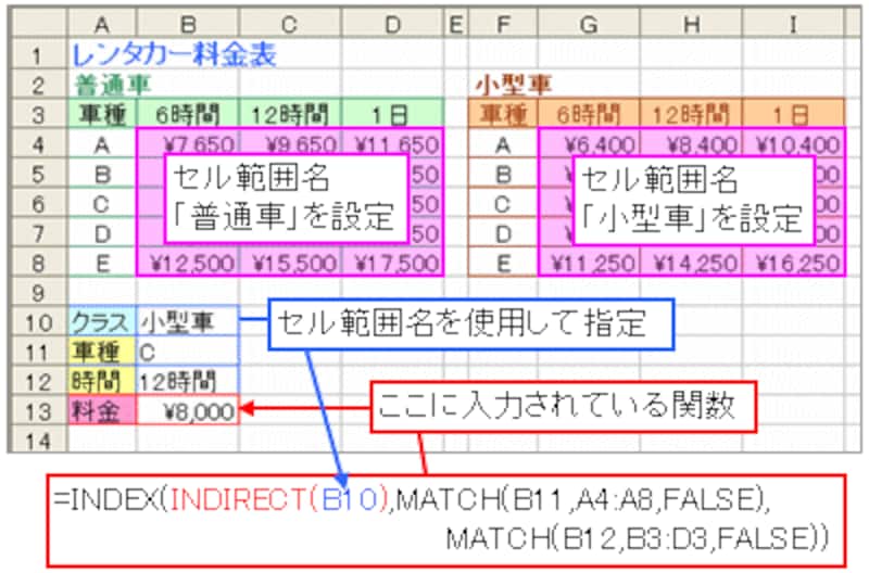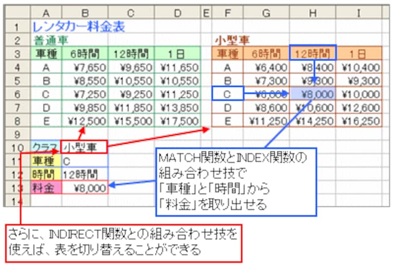 なお、このテクニックは「早見表からデータを取り出そう」で紹介した、MATCH関数とINDEX関数の組み合わせ技にも応用できます。たとえば、下図の「レンタカー料金表」の場合、MATCH関数とINDEX関数の組み合わせ技で「車種」と「時間」から「料金」を取り出しますが、さらに、「普通車」「小型車」になどの「クラス」によって、別表になっています。