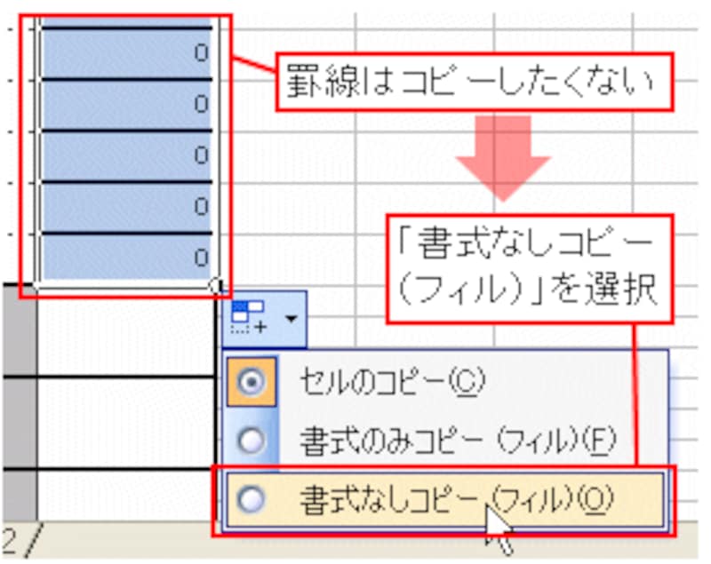 さて。この数式、あと19行分、入力が必要です。上記の手順を19回繰り返すのは面倒ですね。そこで、ここではオートフィル機能を使って、残りのセルに数式を手早く入力してしまいます。このとき、罫線までコピーされないように、ドラッグした後に表示されるスマートタグで「書式なしコピー(フィル)」を選択します。