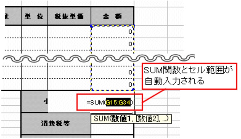 ※まだ、数量や税抜単価を入力していないので、セルG15には「0」が表示されます。