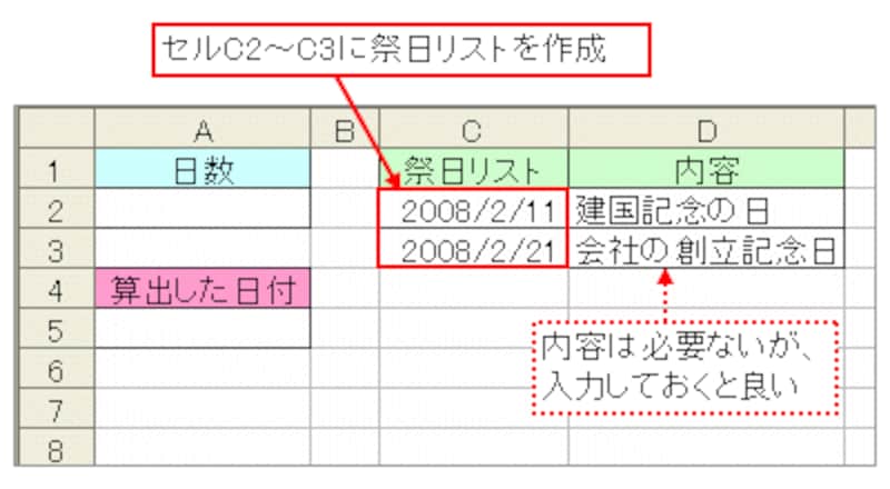 ここでは、今日(2月10日)から営業日10日後の日付を計算してセルA5に表示してみましょう。祭日として、2月11日の「建国記念の日」のほか、2月21日を「会社の創立記念日」として祭日リストを作成します。ここでは、セルC2~C3に作成しました。