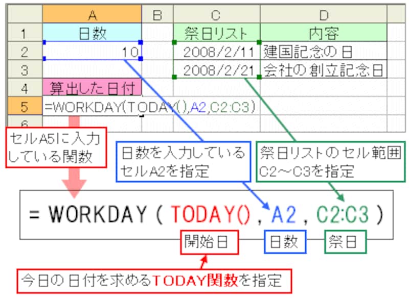 A5 =WORKDAY(TODAY(),A2,C2:C3)と記載します。