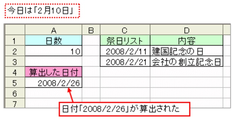 土日と祭日リストの日付を除いた10日後の日付「2008/2/26」が算出されました。