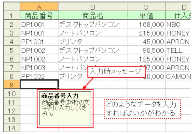 入力規則が設定されているセルを選択したときに、ポップヒント形式で表示されるメッセージです。このメッセージを利用して「どのようなデータを入力するのか」を表示すれば、入力前に内容を確認できるので親切です。