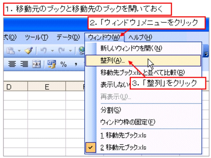 続いて、ワークシートを別ブックへの移動する操作ですが、実は、こちらもドラッグ操作で簡単に行うことができます。移動したいワークシートを含むブックと移動先のブックを開いておいて、「ウィンドウ」メニュー→「整列」をクリックします。![]() |