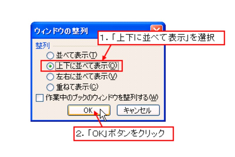 表示された「ウィンドウの整列」ダイアログボックスで整列方法を選択して「OK」ボタンをクリックします。ワークシートを移動する場合は、「上下に並べて表示」がオススメです。