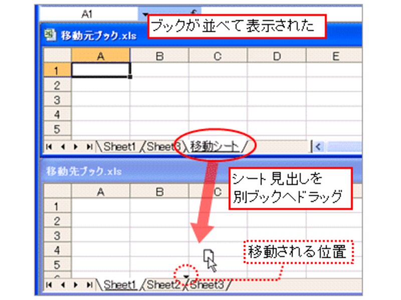 あとは、移動したいワークシートのシート見出しを、移動先のブックへドラッグするだけです。