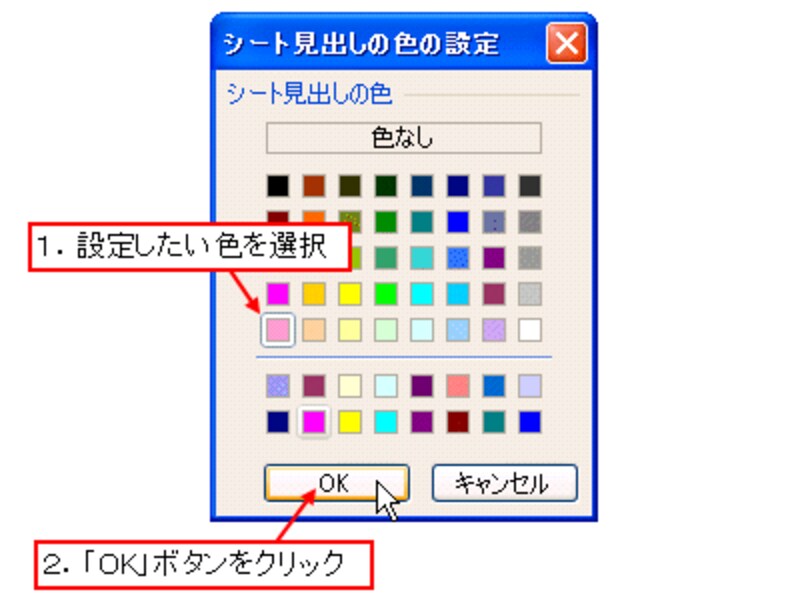 表示された「シート見出しの色の設定」ダイアログボックスで、設定したい色を選択して「OK」ボタンをクリックします。