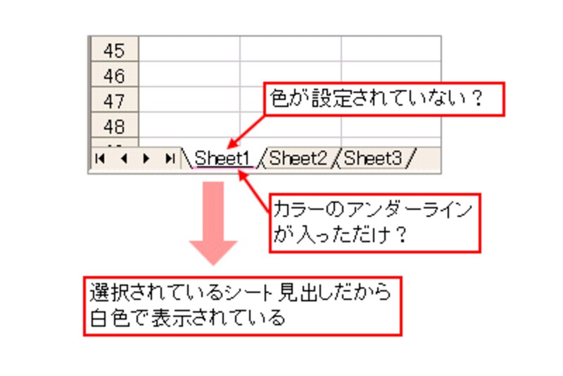 おや?シート見出しに色が設定されていないのでしょうか?よく見ると、シート見出しにカラーのアンダーラインが入っただけのよう?そう思ってしまうのも無理はありません。実は、選択されているシート見出しの色は「白色」で表示されるのです。