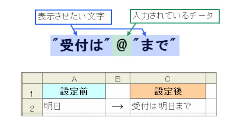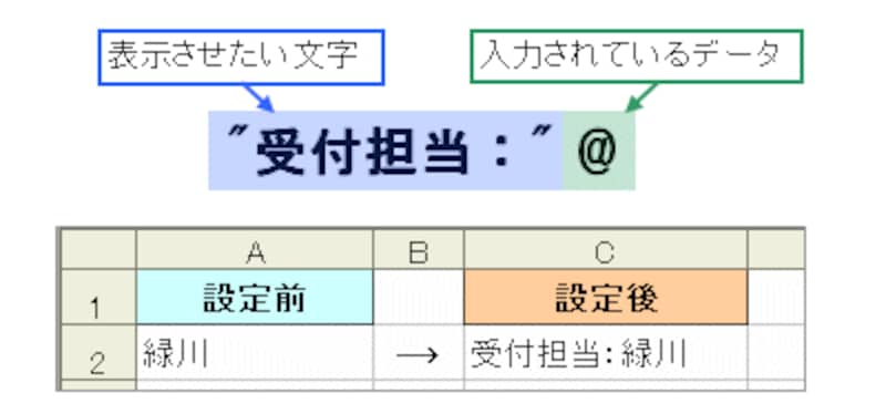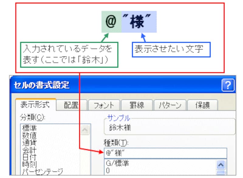 文字列の表示を定義するには、表示したい文字列を「"」で囲みます。「(」「)」「/」「+」「-」「$」は「"」で囲まずに指定できます。また、セルに入力されているデータを「@」で表すことができます。したがって、セルに「鈴木」と入力したときに、「鈴木様」と表示させたい場合は、次のように定義します。![]() |