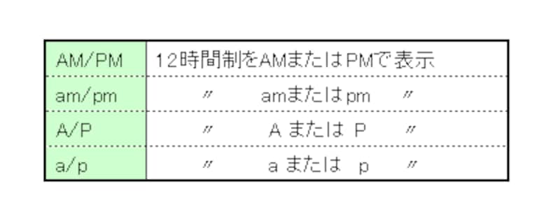 時刻の表示を定義する記号は次の通りです。●時刻の表示を定義する記号