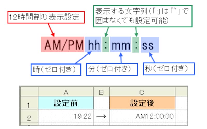 例えば、「19:22」を「PM07:22:00」と表示したい場合は、次のように記述します。「:」は「"」で囲まずにそのまま記述できます。![]() |