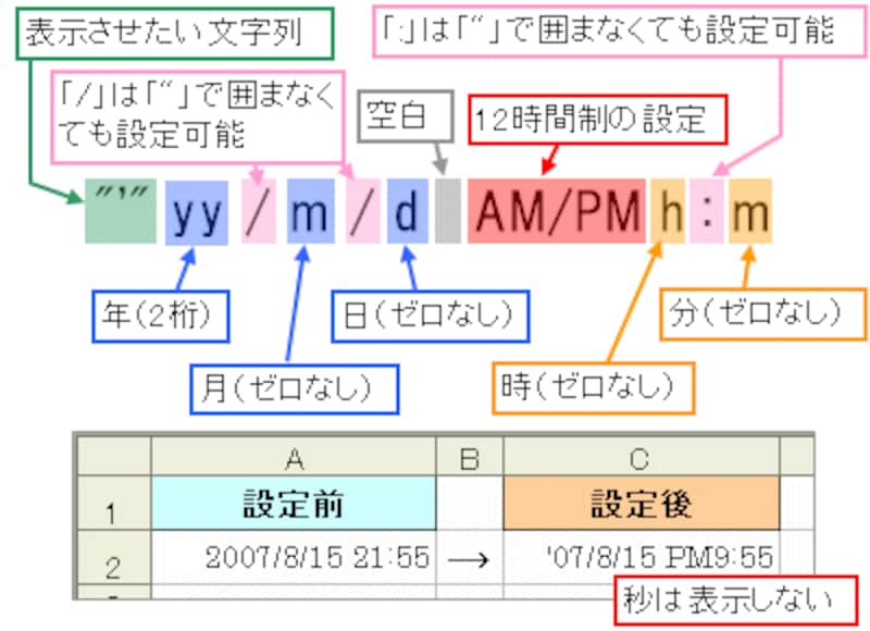 もちろん、日付と併せて設定できます。例えば、「2007/8/15 21:55:00」を「'07/8/15 PM9:55」と表示したい場合は、次のように記述します。