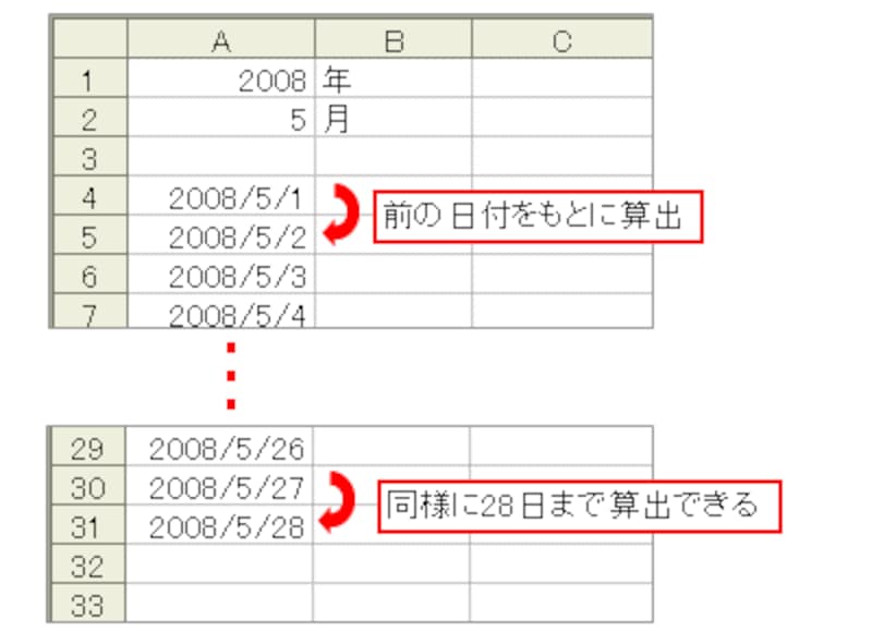 2日から28日までの日付は毎月必ず存在するので、前の日付をもとに簡単に算出できます。