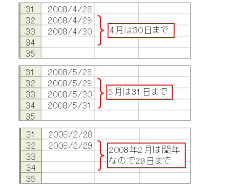 「30日までしかない月」「31日まである月」「2月が閏年の場合」といったように、月ごとに表示される日付が違う部分です。ここが、今回の大きなポイントになる部分です。