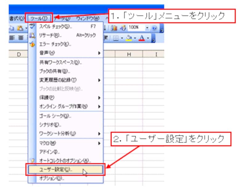 続いて、親メニューとなる部品を確認しましょう。「ツール」メニュー→「ユーザー設定」をクリックして「ユーザー設定」ダイアログボックスを表示します。