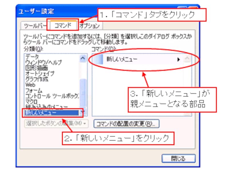 「コマンド」タブをクリックして、「分類」の「新しいメニュー」をクリックします。その右側の「コマンド」の一覧に表示された「新しいメニュー」が親メニューとなる部品です。