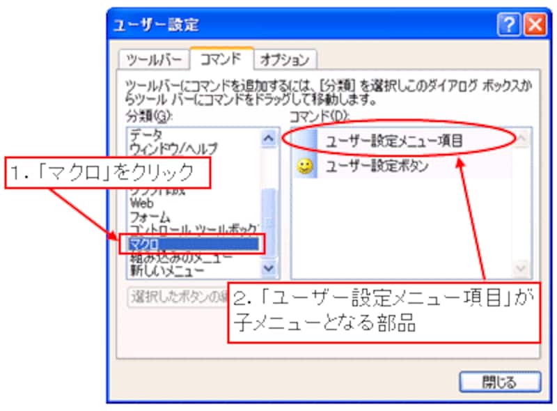 子メニューとなる部品を確認しましょう。「分類」の「マクロ」をクリックします。その右側の「コマンド」の一覧に表示された「ユーザー設定メニュー項目」が子メニューとなる部品です。