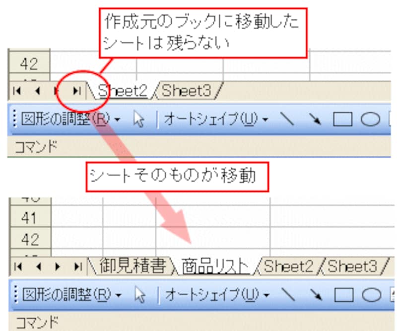 なお、「コピーを作成する」にチェックを入れないで「OK」ボタンをクリックすると、作成元のシートそのものが挿入先のブックに移動します。したがって、作成元のブックに移動したシートは残りません。