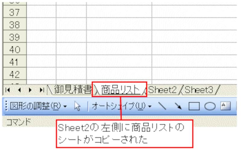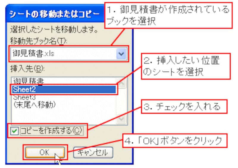 表示された「シートの移動またはコピー」ダイアログボックスの「移動先ブック名」で御見積書が作成されているブックを選択します。すると「挿入先」の一覧に選択したブックに含まれているシート名が表示されるので、挿入したい位置のシートを選択します。