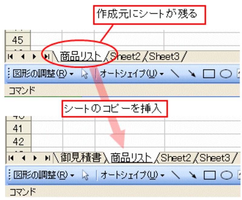 これに対し、今回のように、「コピーを作成する」にチェックを入れておくと、作成元のシートのコピーが挿入先のブックに追加されるので、作成元にシートが残ります。