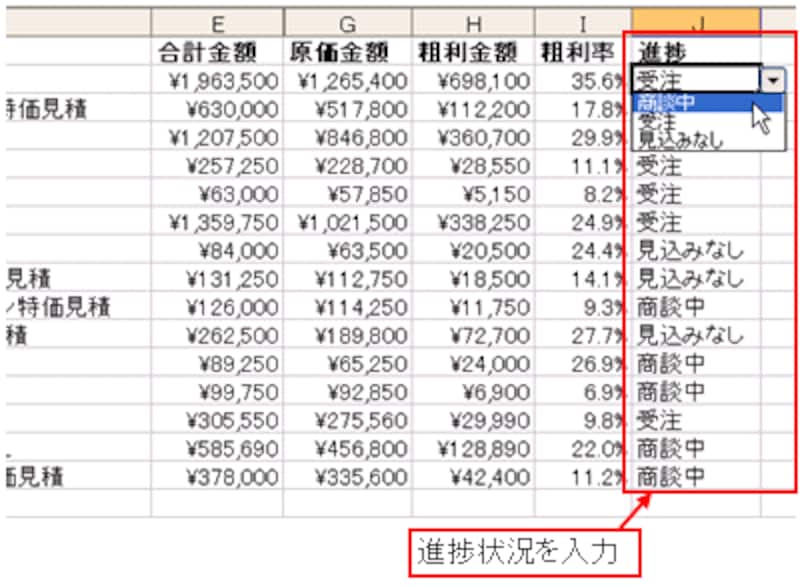 ■進捗状況(「商談中」「受注」「見込みなし」)を入力する項目