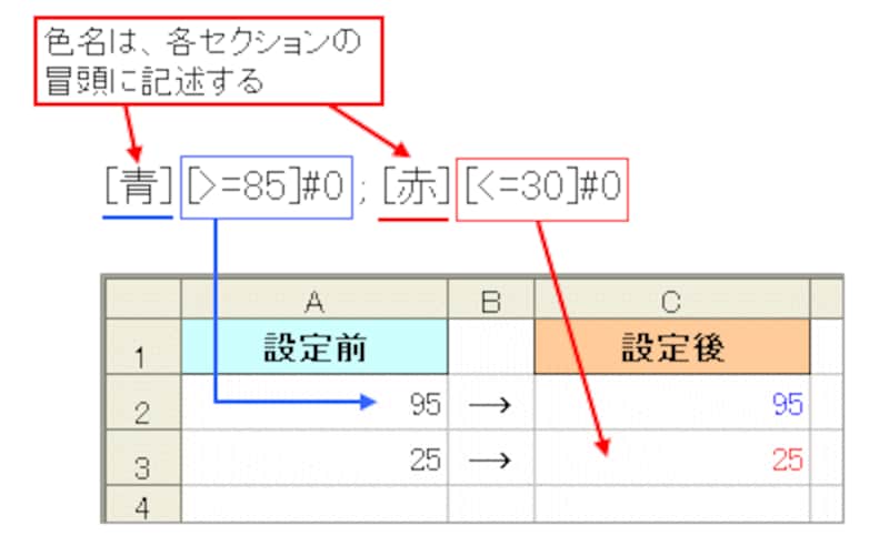 例えば、データが80以上の場合は文字色を「青」、30以下の場合は文字色を「赤」に設定したい場合は、次のように記述します。