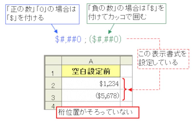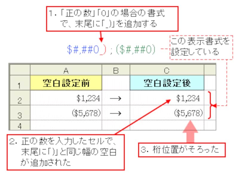 「_(アンダースコア)」に続けて文字を記述すると、その文字幅と同じ空白を表示できます。例えば、データの中にカッコで囲まれた数値がある場合、桁位置がそろわないので見づらいですね。