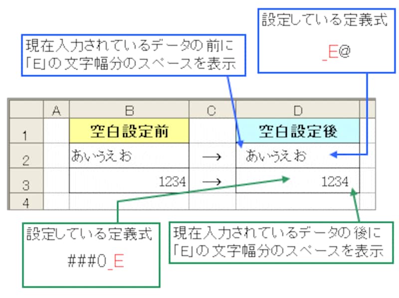 データをセルの端の間にちょっと空白を表示したい、と感じたことはありませんか?そんなときにも、このテクニックを応用できます。左詰めの文字データであればデータの先頭、右詰の数値データであればデータの末尾に、「_(アンダースコア)」に続けて、表示したい空白の幅を持つ文字や数値・記号を設定します。