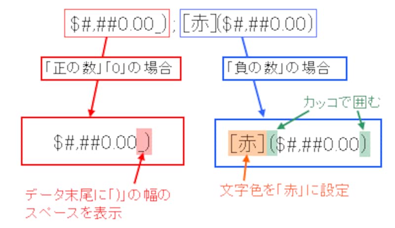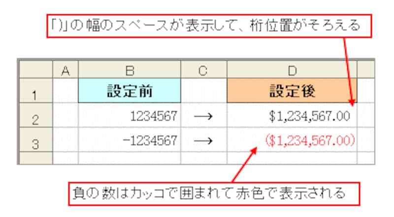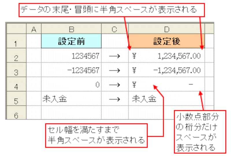この文字は、次のように、「セルの左端に『?』、右詰で数値、その間に空白」を表示する場合などに利用できます。セル幅が変わっても指定した文字が繰り返し表示されるので便利です。この場合、「?* #,###,##0」などと記述します。