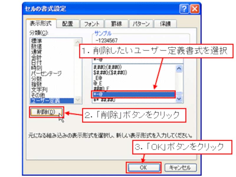 なお、ユーザー定義書式を削除するには、「セルの書式設定」ダイアログボックスの「表示形式」タブで、削除したいユーザー定義書式を選択して「削除」ボタンをクリックし、「OK」ボタンをクリックします。