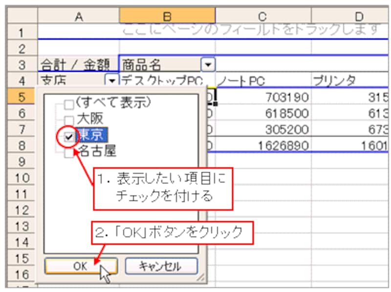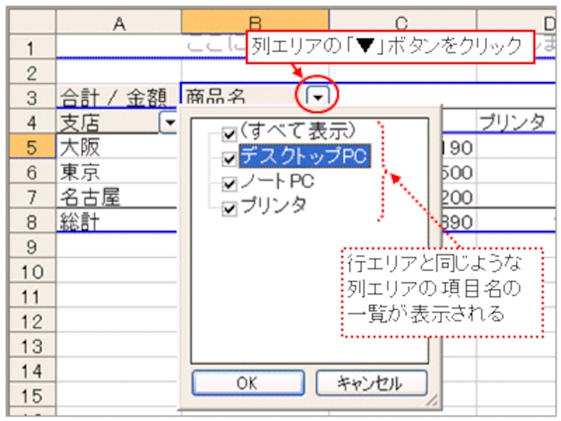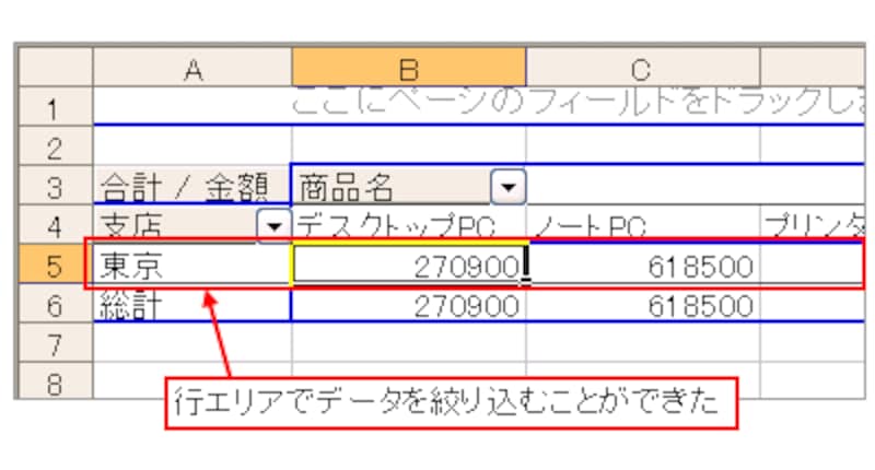 「ピボットテーブルの使い方」では、ページエリアでデータを絞り込む方法を紹介しました。今回は、行エリアでデータを絞り込む方法を紹介しましょう。※ Excel 2007以降の場合では、画面表示に少し違いはありますが、操作方法は同じです。