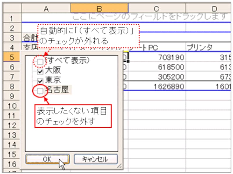 まず、行エリアの「▼」ボタンをクリックして、「(すべて表示)」のチェックを外します。