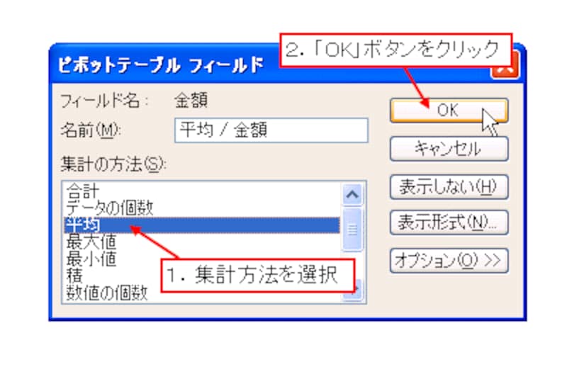 表示された「ピボットテーブル フィールド」ダイアログボックス」の「集計の方法」の一覧から、変更したい集計方法を選択して「OK」ボタンをクリックします。